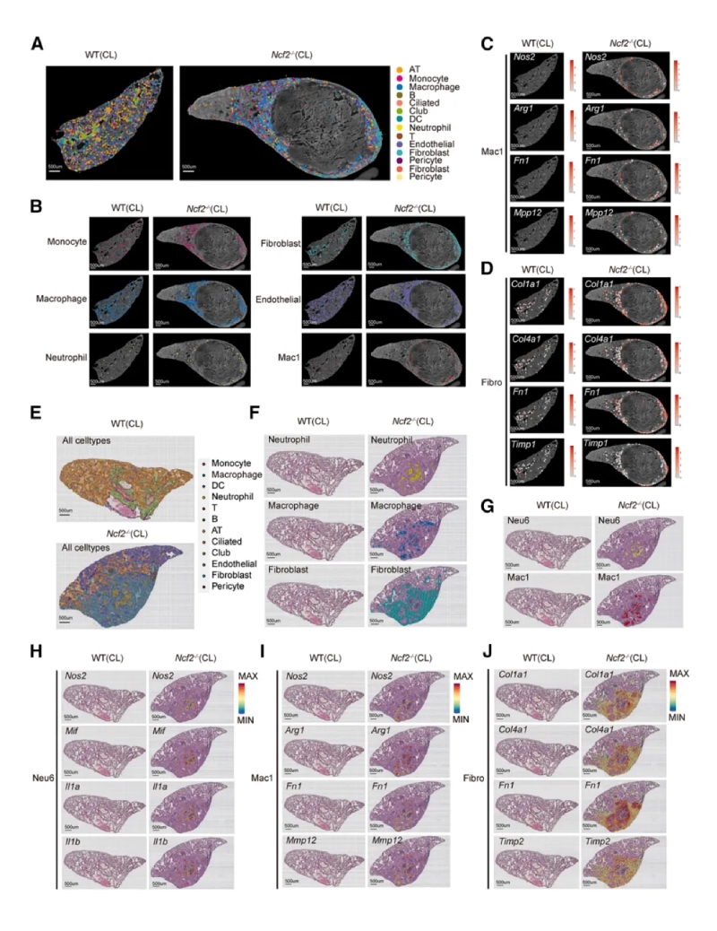 慢性肉芽腫病(Chronic?Granulomatous?Disease,?CGD)是一種由NADPH氧化酶2(NOX2)復合體功能缺失突變引起的原發(fā)性免疫缺陷病。這種缺陷會導致產生ROS的多種先天免疫細胞受到損害,機體抵御微生物的能力下降,導致CGD患者易發(fā)生反復感染和過度炎癥反應。本研究通過構建自然CGD小鼠模型,結合單細胞轉錄組(scRNA-seq)和空間轉錄組技術(包括BMKMANU?S1000平臺),深入解析了CGD肺部肉芽腫形成的細胞與分子機制,從CGD肺肉芽腫組織中鑒定出具有NOS2高表達特征的中性粒細胞和MMP12+巨噬細胞,并提出MIF和Morbidity為CGD治療的潛在靶點。